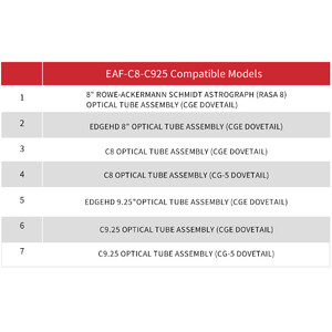Este kit adaptador permite ligar o EAF a vários telescópios Celestron SC. Na montagem, o anel laranja permanece no telescópio. O suporte é montado adicionalmente.