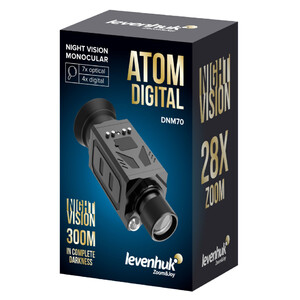 O monóculo Levenhuk Atom Digital DNM70 é um aparelho de visão noturna confiável, projetado para observações em condições de pouca luz. Com a sua ampliação ótica de 7x e um zoom digital adicional de 1x, 2x, 3x ou 4x, permite a observação de objetos à noite a uma distância de até 300 metros com grande detalhe. Durante o dia, oferece uma visão ilimitada. O vidro ótico de alta qualidade proporciona imagens nítidas e brilhantes. Um amplo campo de visão de 20° e uma focagem próxima de 5 metros permitem localizar e seguir rapidamente objetos em florestas, áreas abertas e ambientes urbanos.