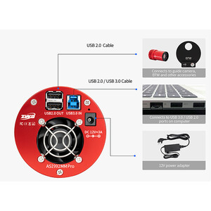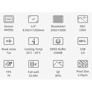 A ZWO ASI992MM Pro estabelece novos padrões na área SWIR: combina um sensor InGaAs especializado com alta sensibilidade na faixa de até cerca de 1,7 µm, uma potente refrigeração de duas fases, baixo ruído de leitura e armazenamento de dados sólido.