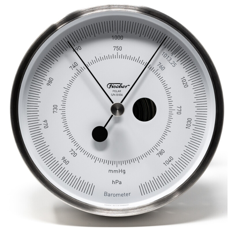 O barómetro serve para medir a pressão atmosférica em hPa (precisão de medição: ± 2 hPa). Para medir a pressão atmosférica, é utilizada a deformação de uma lata metálica plana e vazia. O aumento da pressão atmosférica comprime a lata, enquanto a diminuição da pressão atmosférica a expande novamente. Este movimento, que é de apenas algumas centésimas de milímetro, é transmitido ao ponteiro por meio de um mecanismo preciso, indicando assim a pressão atmosférica.