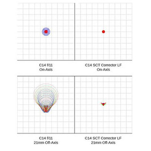 A nitidez é excelente numa diagonal de 42 milímetros, com tamanhos de pontos até 9x menores do que os do telescópio nativo! A relação de abertura é aumentada para 1:7,3 no C14 e para 1:7 no C11, o que significa um aumento de velocidade de 2,3x e 2x, respetivamente.