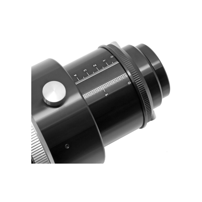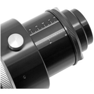 Em vez de pequenos rolamentos de esferas, como nos focadores Crayford, uma calha sólida de aço inoxidável assume o rolamento e também a fixação lateral.