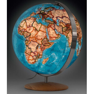Mais de 2.000 nomes geográficos estão registados neste globo iluminado revestido à mão. O texto é claro e cada país é representado por uma cor diferente, com um tom mais escuro nas fronteiras para destacar o mapa político.