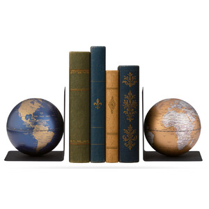 Dois elegantes suportes para livros em metal com globos combinam funcionalidade e espírito explorador.