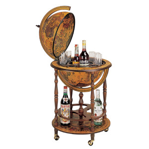Globo com pedestal e bar com ilustrações maravilhosas de monstros marinhos, sereias e figuras mitológicas no mapa. O globo Regolo possui no interior um compartimento para bebidas com capacidade para 2-3 garrafas baixas e cerca de 9 copos. Outras garrafas podem ser colocadas na prateleira inferior, decorada com uma rosa dos ventos e totalmente em harmonia com os signos do zodíaco ao redor do equador.