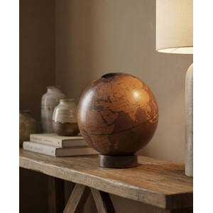 A base em madeira de faia local trabalhada à mão envolve uma esfera em couro sintético, formando assim um globo de mesa que confere a qualquer espaço um toque pessoal e inconfundível.