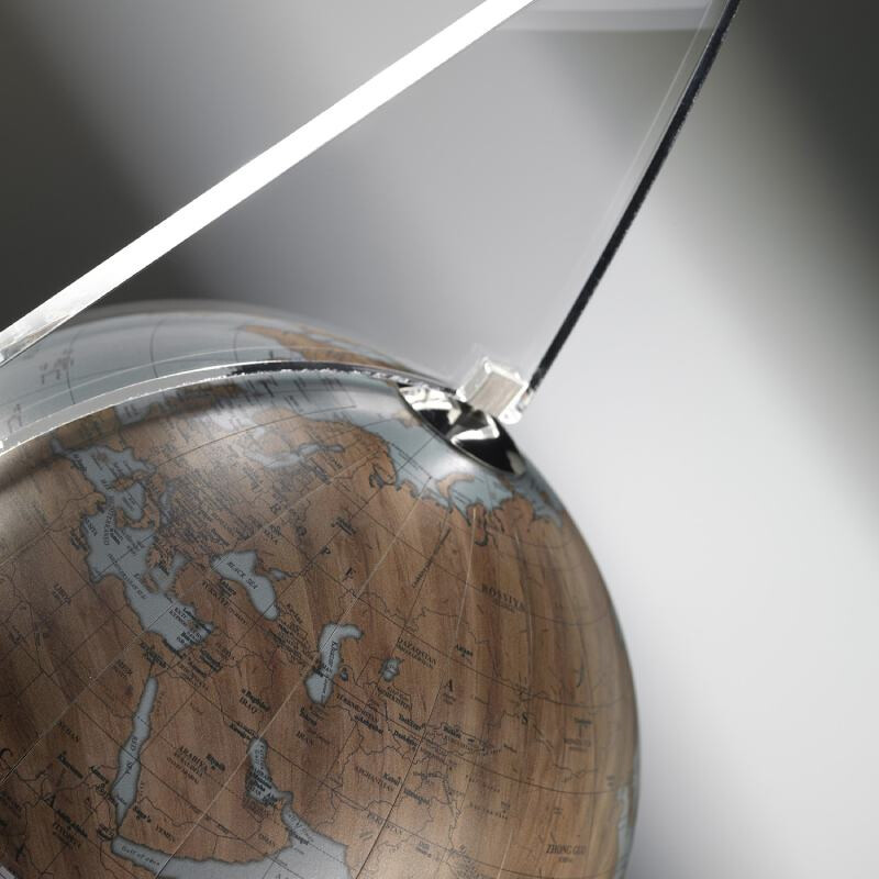 Este acessório para qualquer interior de bom gosto é fabricado em aço inoxidável e vidro acrílico. O globo, que parece estar a flutuar, é giratório e revestido com um mapa atualizado e elegante.