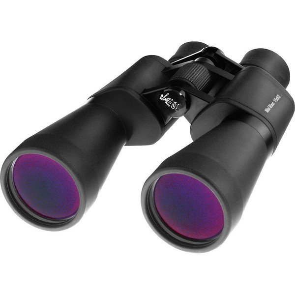Our 15x63 Mini Giant Binocular grabs more light than a 50mm glass yet it doesn't have the weight or bulk of larger, "giant" binoculars. Its 63mm objective lenses deliver bright images of stellar clusterings and other celestial lollipops that adorn the evening sky. Of course, this Mini Giant binocular excels for daytime viewing as well. Its lenses and high-grade BAK-4 prisms are fully multi-coated to permit the highest light transmission possible. The aluminum barrels are internally glare-threaded to ensure rich contrast and eliminate ghosting. Images are sharp, bright, and wonderfully vivid. Contributing to this Mini Giant's comfort factor is its long eye relief. Even eyeglass wearers will see edge to edge. Its relatively compact size allows this Mini Giant binocular to be hand-held comfortably. For extended gazes, you'll want to tripod-mount it for steady images. It comes with a hard case, deluxe wide neck strap, and lens caps. Five-year limited warranty.