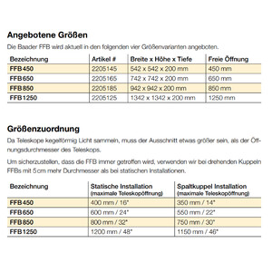 Graças ao seu design inovador, desenvolvido especificamente para telescópios de grandes dimensões, a FFB proporciona uma distribuição de luz muito uniforme por toda a superfície e em todo o espectro. Através dos LEDs coloridos adicionais (vermelho, verde, azul), é possível compensar de forma precisa a diferença de luminosidade entre os diferentes filtros. Desta forma, é possível obter flats calibrados com precisão, mesmo com câmeras a cores e câmeras de banda dupla.