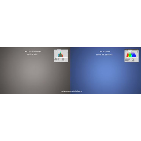 A particularidade do gerador Flatfield é que ele fornece uma luz muito neutra em termos de cor, ou seja, os canais de cor têm a mesma saturação, o que é a base ideal para um flat bem-sucedido. Além disso, a iluminação é extremamente uniforme.