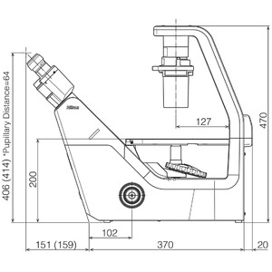 Focalização: At ravés do movimento para cima/para baixo da peça nasal, Curso (manual): Para cima 7 mm, para baixo 1,5 mm. Curso grosso: 37,7 mm por rotação, Curso fino: 0,2 mm por rotação, Torque de movimento grosso ajustável
