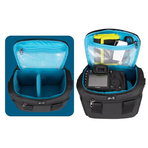 Esta bolsa de ombro oferece espaço para uma câmera Syterm ou uma câmera DSLR compacta com objetivo padrão e um flash ou uma segunda lente.