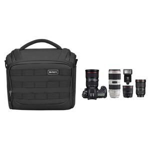 Esta bolsa de ombro grande oferece espaço para uma câmera Syterm ou DSLR com várias lentes e um flash ou uma segunda caixa. Lentes teleobjetivas até 70-200 mm f:2.8