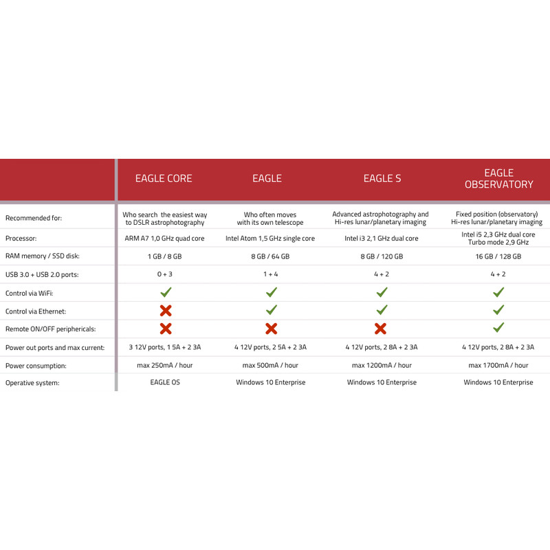 O EAGLE controla a câmera e outros acessórios e fornece energia a todos os sistemas. Através de WLAN, pode controlar todo o equipamento sem fios com o EAGLE através do seu smartphone, tablet ou computador portátil. O EAGLE é baseado no Windows 10. Com o EAGLE, pode utilizar uma variedade de programas, por exemplo: Cartes du Ciel, PHD2 Guiding, BackyardEOS, BackyardNIKON, MaximDL, Voyager.