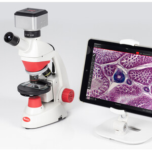 Um microscópio digital para principiantes. A câmera Wi-Fi com resolução de 4 MP permite uma rápida transferência de imagens para tablets e smartphones. Uma alça para transporte, uma base pequena para fácil armazenamento e parafusos embutidos para proteger contra o desajuste acidental das oculares e do tubo tornam o RED50X Plus o companheiro ideal para uso escolar.