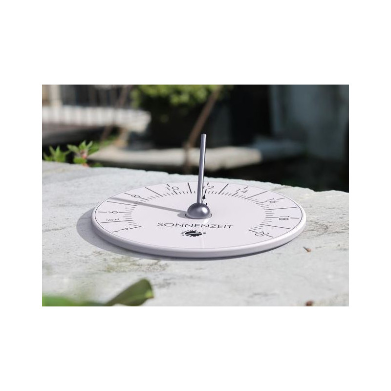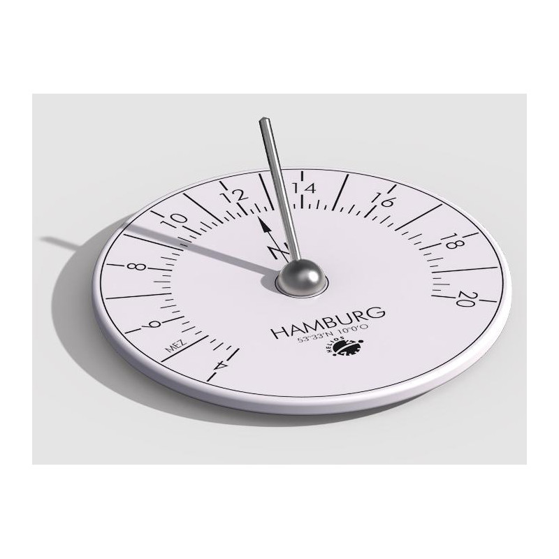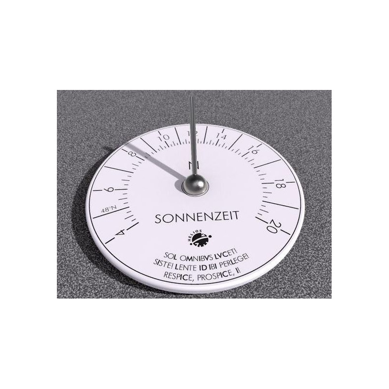 Die aufgedruckte Sonnenuhrskala wird witterungsbeständig in die Glasur eingebrannt. Die zentrale Halbkugel aus Edelstahl nimmt im Winkel des Breitengrads den Schattenwerfer auf. Die Sonnenuhr steht auf drei Kautschuckfüßchen und kann sowohl auf der sonnigen Fensterbank als auch ganzjährig im Freien aufgestellt werden.