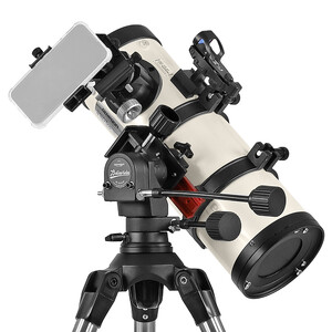 Talvez a parte mais emocionante do conjunto de acessórios seja o adaptador de smartphone. Com ele, pode fixar o seu próprio telemóvel diretamente na ocular e tirar fotos do que está a observar. Registe as paisagens craterizadas da Lua ou fotografe Júpiter com as suas luas. O controle do obturador Bluetooth incluído garante fotos sem tremulação. Partilhe o seu fascínio pelo céu estrelado com a sua família e amigos. Não poderia ser mais fácil.