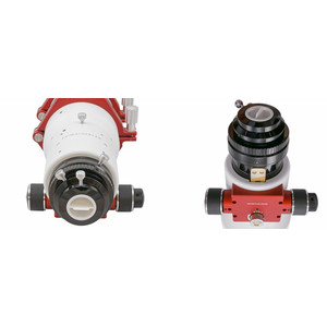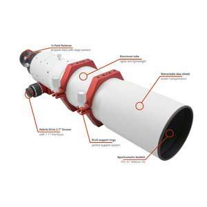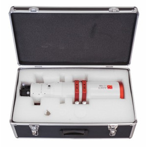 Este refrator incolor (lente FPL-53) é ideal para fotografar objectos celestes extensos utilizando câmeras com um sensor grande (por exemplo, DSLR). Isto também inclui câmaras reflex full-frame, ou seja, com sensores maiores do que o formato APS-C. Graças ao longo percurso de focagem do focador de 95 mm, este telescópio refratário também pode ser utilizado visualmente.