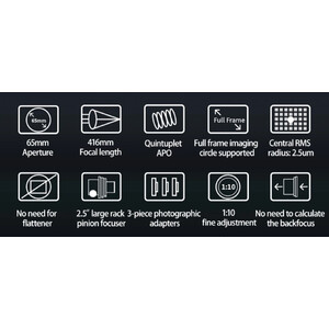 Em vez de adquirir flateners adicionais, calcular o backfocus do flattener ou ajustar a distância correta, pode equipar este apocromático com vários acessórios fotográficos, manter o objeto em foco e todo o sistema ótico estará perfeitamente ajustado para a captura.