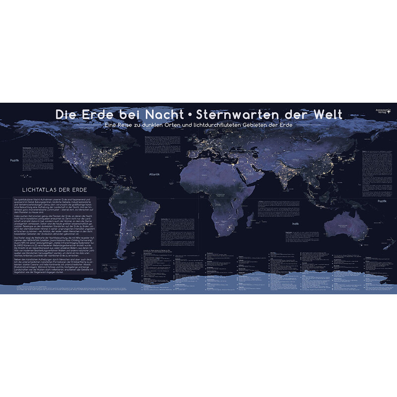 Em todos os lugares onde os seres humanos habitam o planeta, eles deixam padrões de luz à noite. Onde é possível identificar centros urbanos, áreas rurais, locais industriais e ligações de transporte? Como são os mares, a vegetação e os desertos à noite? E quais locais ainda não são iluminados por fontes de luz artificial? Este impressionante poster em formato grande explica e ilustra detalhadamente a famosa fotografia «Earth at night» da NASA com muitos textos e elementos cartográficos.